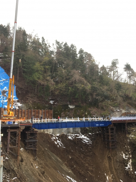 国道413号線で起きた土砂崩れの現場に仮桟橋を設置し、