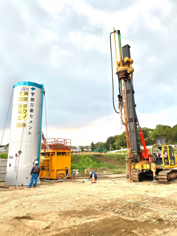 今回は深層混合処理工法である技術審査証明取得済みのオリジナル工法「Tコラム工法」を採用。