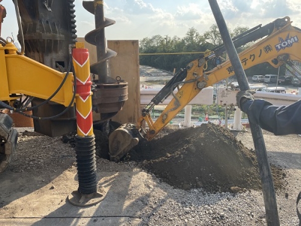 電線下の上空制限のある街路築造現場にて、MD250低空頭セメントミルク工法での山留工事を行いました。
