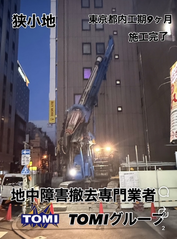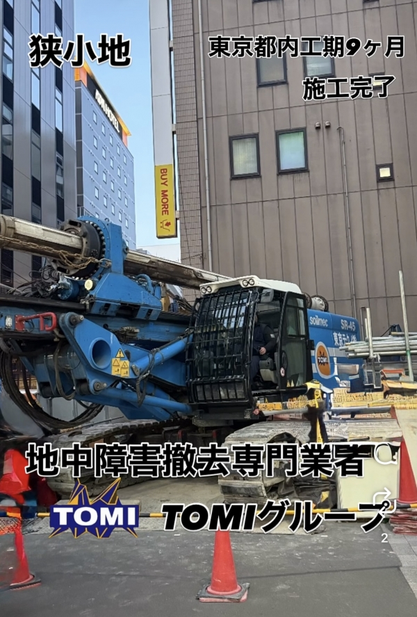 重機搬入や作業スペースに制約のある狭小地において、地中障害撤去の長期施工9ヶ月(2025.5~2026.1)を無事完了。確かな技術力と現場対応力で、困難な条件下の工事にも確実に対応しています。関係各位のご協力により無事終了したことに感謝申し上げます。